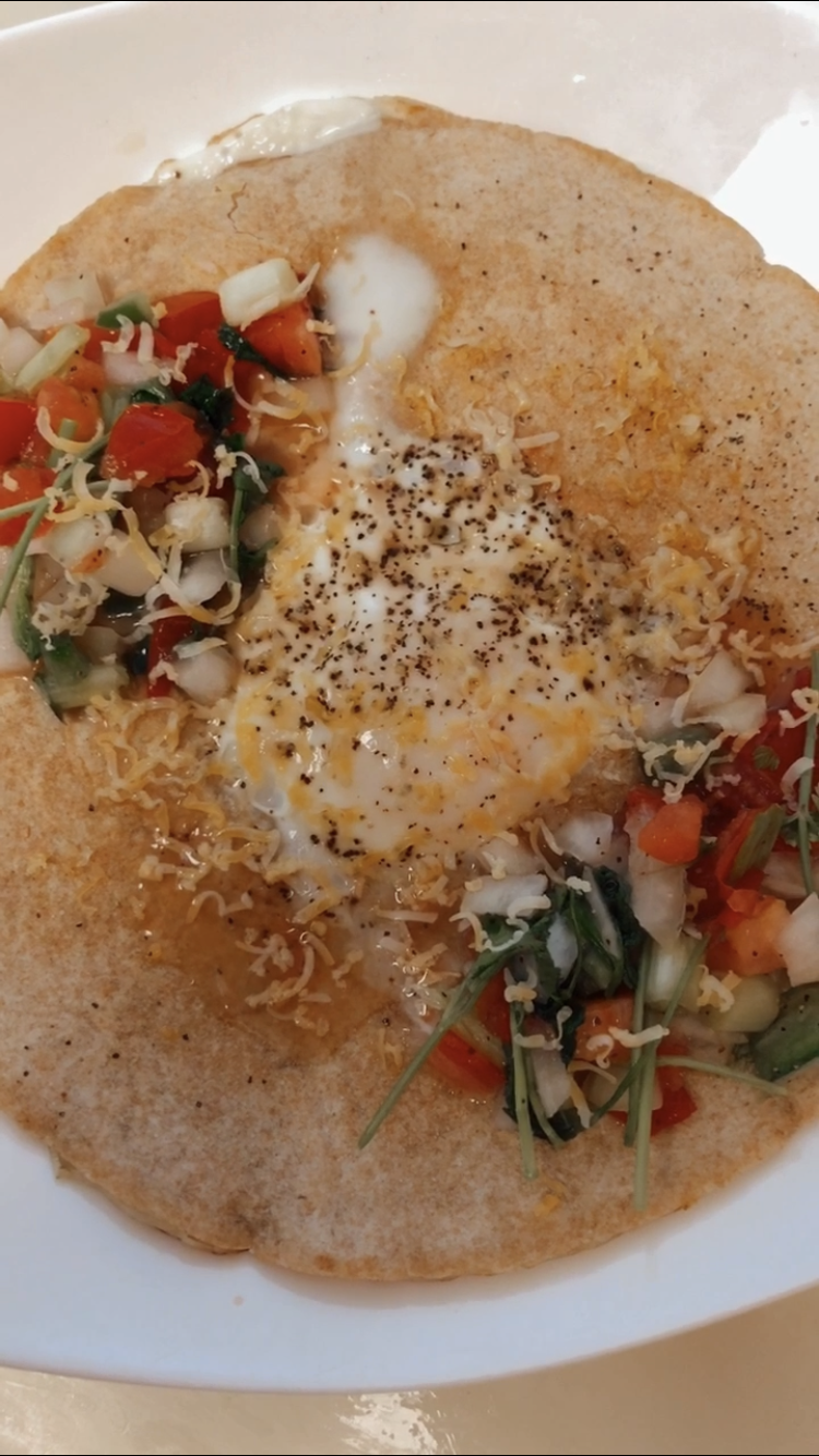 - Place quesadilla back on skillet and crack an egg in the center.